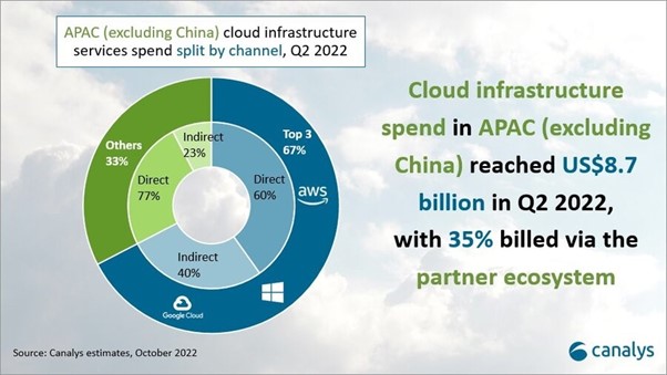 In 2022, the spend on cloud infrastructure in the Asia Pacific region reached US$8.7 billion in the second quarter. This figure represented an increase of 35% and constituted 14% of the worldwide spend on cloud services.