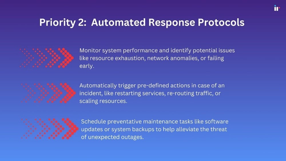 Automated Response Protocols (ARPs) are another way to significantly help prevent IT outages by using data to quickly initiate corrective actions like restarting services, re-routing traffic, or notifying relevant personnel when problems are detected.