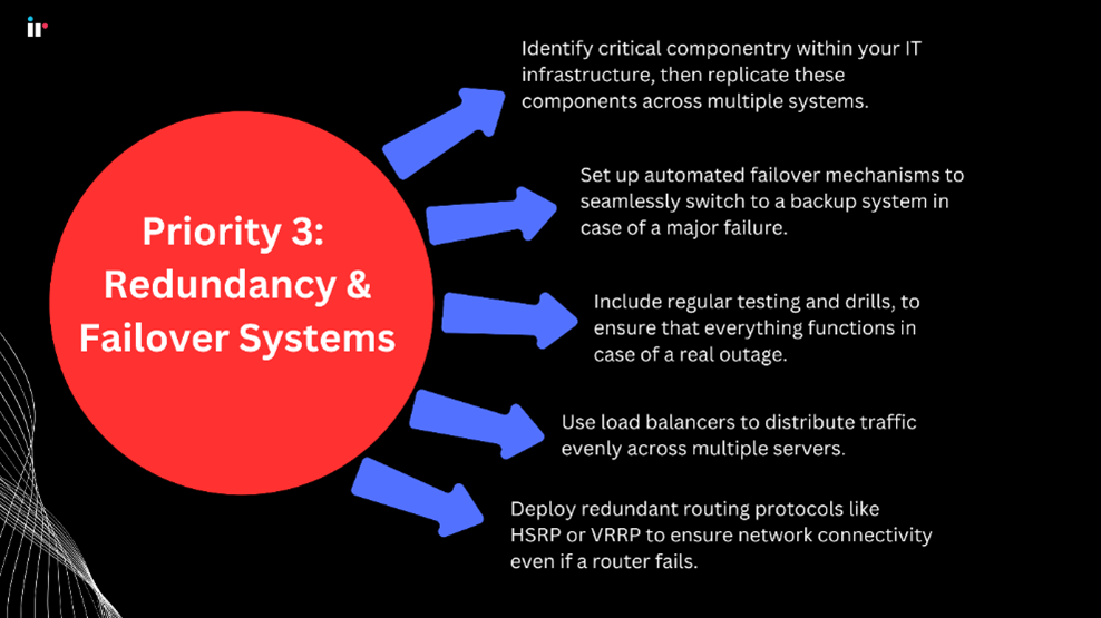 To implement redundancy and failover systems, it’s important to first identify critical componentry within your IT infrastructure, then replicate these components across multiple systems. Set up automated failover mechanisms to seamlessly switch to a backup system in case of a major failure.