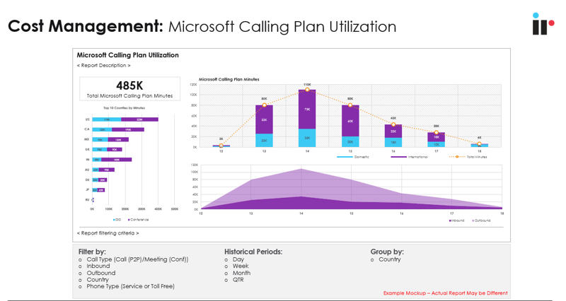 Detailed reports can show breakdowns of calling plan utilization and calling plan cost. They can also show call costs within specific regions for Direct Inward Dialling (DID), and which regions are experiencing higher costs for conferencing and make an informed decision on other cost management initiatives, like moving to Direct Routing.