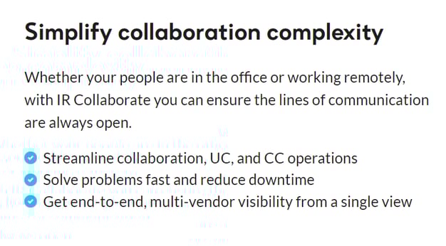 Businesses may use different technologies like Avaya, Cisco Webex , Zoom or Microsoft Teams, but there are different analytics and monitoring solutions for each. This makes it even more complex, because you can't get real time insights on what's going on right across the entire picture. IR's Collaborate suite of solutions offer enterprise grade performance management, monitoring and troubleshooting across voice, video and collaboration ecosystems.