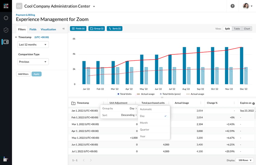 Curious pro-users can do more with this data – you can compare it with the previous period and corresponding period or even find a simple moving average. On top of this, you can group by Day, Month, Quarter, year or any custom period you are after. So, with this, along with finding the license usage for a Calendar year, you can also compare the previous year to understand the usage and adoption more precisely.
