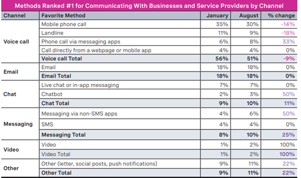 Communications channel usage and preferences have evolved in a short time. While video chat adoption and the use of chatbots and AI surged during the pandemic, other channels lost ground. For example, interaction by mobile phone remains the preferred method for consumers to connect with businesses and service providers.
