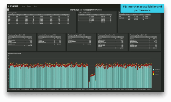 While processing transactions on a platform, organizations commonly extract information directly or run batch reports to get an overview of how the ecosystem is running. Prognosis collects this information in real-time and displays it on a dashboard that makes sense to your business. In the example dashboard view below depicting interchange visibility, the upper left corner shows metrics for all the interchanges we're connected to. It shows the type of transaction, transactions per second, transactions during the current refresh interval, amounts processed, approval rates, response times, etc. The top middle pane shows metrics for credit vs. debit transactions and the top right column shows EMV vs. mag stripe transactions.