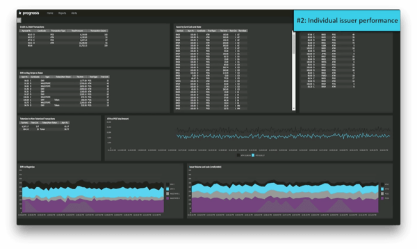 In the second row from the top, we have a view of EMV vs. mag stripe vs. tokenized transactions. In the next row is a pane dedicated strictly to tokenized vs. non-tokenized transactions. Next to that is a graph of ATM vs. POS total amount. The bottom left shows EMV vs. mag stripe, and the lower right shows issuer volume by card code. This gives a nice view of all the different metrics that may be concerning to an issuer of cards.
