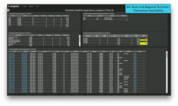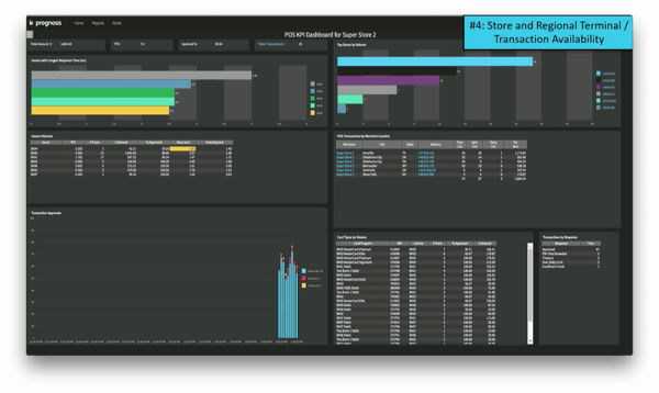 The second row on the right-hand side shows POS transactions by merchant location, which allows you to dig down into individual merchants. (We'll dive deeper into the performance of a specific store in item #4.) On the lower left corner, we have a graph of transaction approvals, which shows how the whole switch is performing. The lower right shows card types by volume.