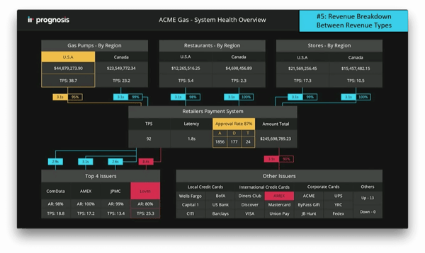Below is an overall view of an entire processing environment. This type of dashboard view is compelling because it breaks items down by product type. In this case, we're looking at a processor for truck stops, which includes gas pumps, restaurants, and convenience stores by region. As you can see, this view also has visual alerts built around individual metrics. On the upper left is a yellow alert showing that approval rates are lower than normal. The information gets filtered down into the payment system itself in the center pane, and then drills down further into the issuers and authorizers of the card transactions. (This example demonstrates how it's possible to actually drill down all the way through the transaction path and gain visibility into the entire ecosystem.)