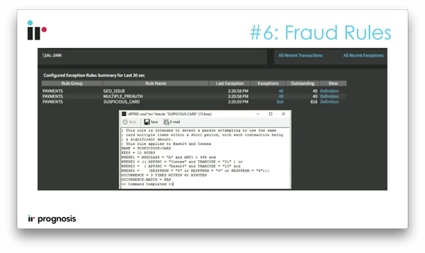 Prognosis isn't a full-fledged fraud product, but it is possible to apply rules to realtime transactions in order to isolate anomalies or look for certain conditions in the environment that may indicate abnormal patterns in transactions. You can deploy these kinds of rules very quickly by making a simple change of configuration. The example dashboard view below shows a list of three rules that have been deployed: a geography check because the same PAN cannot possibly be used in two different physical locations within the same time period, a multiple preauth rule to see if someone is performing a transaction to check the validity of a card, and a suspicious card rule that might find $1 transactions at gas pumps.