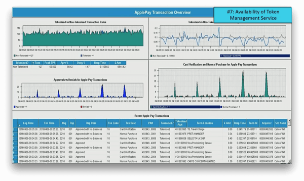 You can also see the response time differences between tokenized and non-tokenized transactions in the upper right corner. (This is a critical piece of information. You will likely get different total response times due to using a token service or some kind of external entity that provides a tokenized PAN.) In the left-hand side of the second row, you can see the non-tokenized transaction response times, Peak TPS, etc. Under that is the approvals vs. denials for Apple Pay transactions. On the right side of this column we can see call verification and normal purchases for Apple Pay transactions. The bottom pane shows a table with relevant transaction details. In the seventh column of this table, we get visibility into whether it was a card verification or normal purchase.