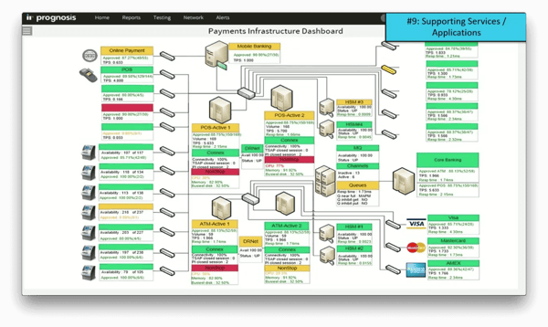 Live Canvas takes a Visio diagram of a processing environment and integrates it with the realtime Prognosis data to create a visual display. In the upper left corner of the example above is the online payment channel. In this case, we're visualizing the approval rate and transactions per second. As you work your way down, you can see different channels of acquiring endpoints. They might be grouped together by partners you're receiving a transaction from, or by regional ATM or POS devices. (We can also drill down into the actual IT infrastructure.) Data metrics being collected in the background can be applied to all those endpoints, and a visual notification can be displayed if an issue occurs.