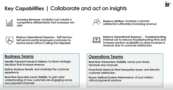 Business teams want insights on commercial metrics, like sales and costs. How to win new customers and retain existing customers. They want to know what happens at the point of purchase, such as decline volumes, wait times associated with receiving a response on a payment terminal, or the increasing use of a particular payment method at a point of sale.