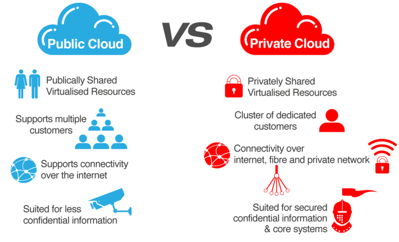 Before we look deeper into hybrid cloud benefits, let's take a look at the key differences/advantages/disadvantages between private cloud and public cloud.