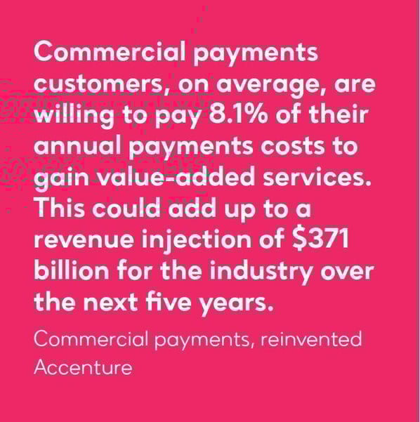 Commercial customers also are willing to pay 8.1% of their annual payments costs to gain these services, adding a revenue injection of $371 billion for the industry over the next five years, according to Accenture.[20]