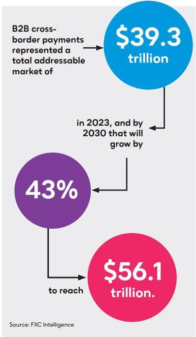 In 2023, year-over-year revenue growth for publicly traded B2B cross-border payments companies tracked at above 40%, more than twice the mean for consumer-focused cross-border payments players, according to FXC Intelligence.[23] B2B cross-border payments represented a total addressable market of