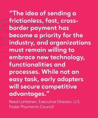 “The idea of sending a frictionless, fast, cross-border payment has become a priority for the industry, and organizations must remain willing to embrace new technology, functionalities and processes,” he writes in a Forbes column. “While not an easy task, early adopters will secure competitive advantages.”
