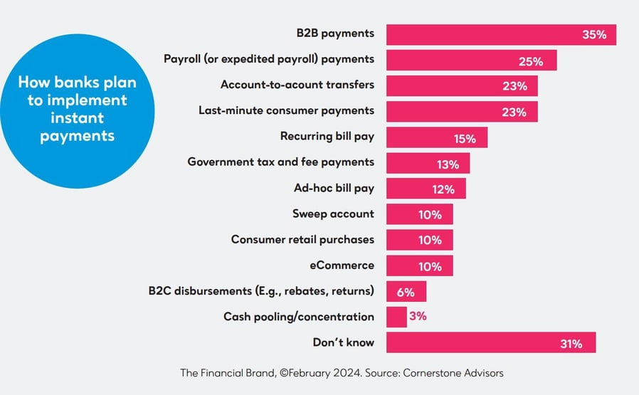 When it comes to specific use cases banks plan to implement for instant payments, Cornerstone Advisors research shows that B2B payments are No. 1 (35%).