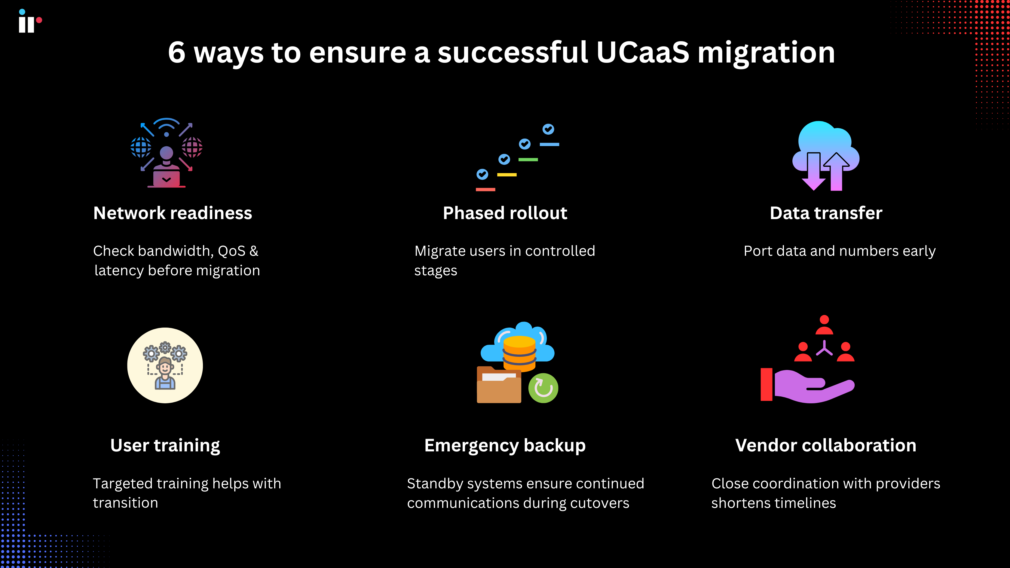 Vendor collaboration accelerates success. Close coordination with your UCaaS provider shortens timelines and helps anticipate hidden challenges.
