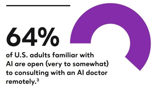 - 64% of U.S. adults familiar with AI are open (very to somewhat) to consulting with an AI doctor remotely.
