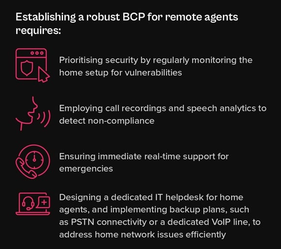 A dispersed, remote workforce adds to the complexity of an organisation’s business continuity plan (BCP). Agents working from home must deliver the same level of CX as those based in office setups. Different strategies are required for BCP in the Work from Anywhere model to address specific issues. For remote agents, additional complexities include: